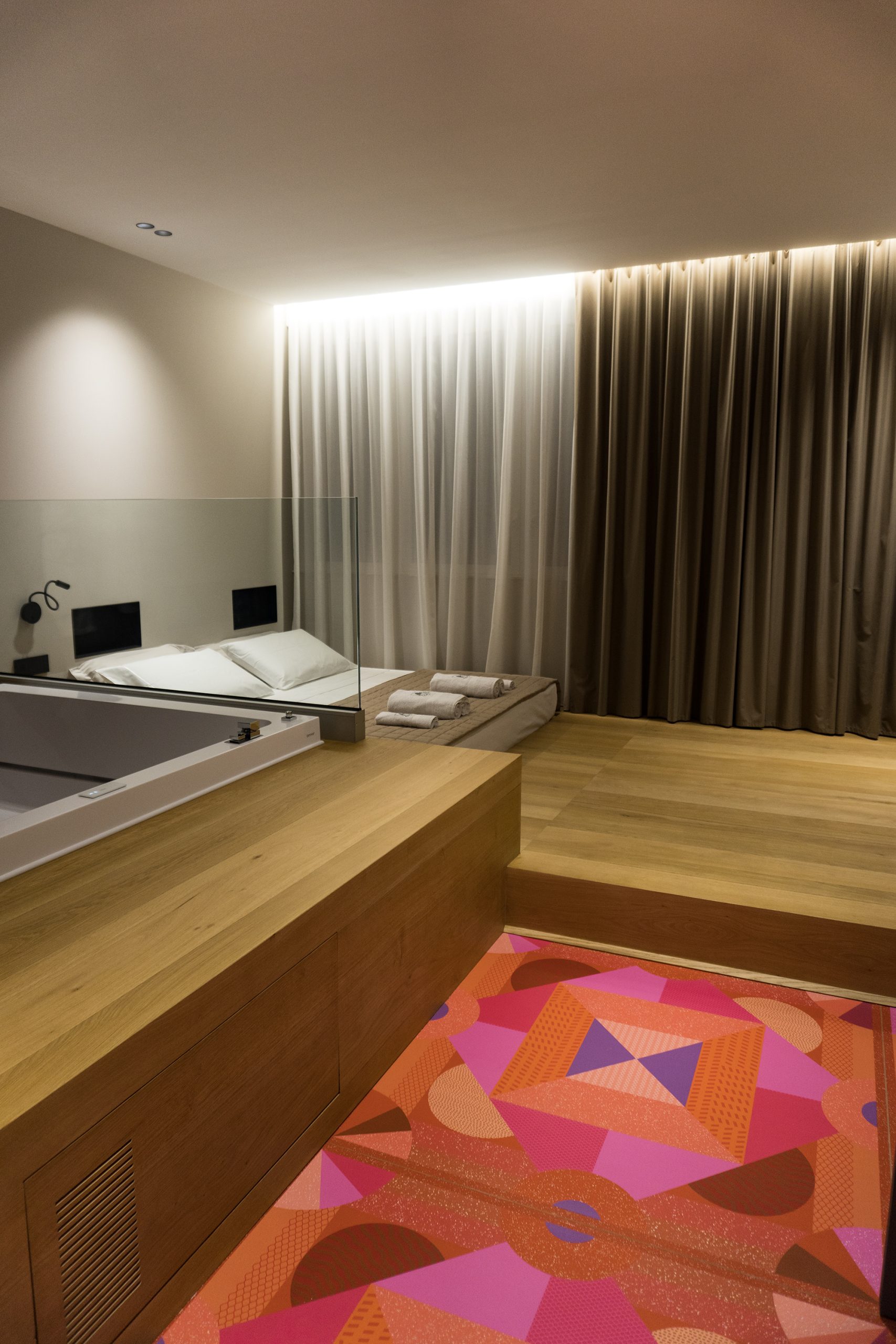 La cura dei dettagli la caraterizza, è una suite di 28mq, ideale per 2 o 3 persone. Composta da una zona letto con un materasso matrimoniale King-Size ed un letto singolo, entrambi adagiati su una pedana rivestita in rovere. Accanto vi è un’ampia vasca idromassaggio, a completare un bagno con vetri oscurati dotati di tutti i comfort e una sfarzosa doccia.